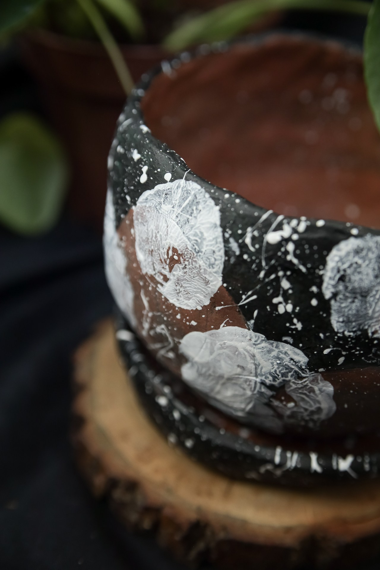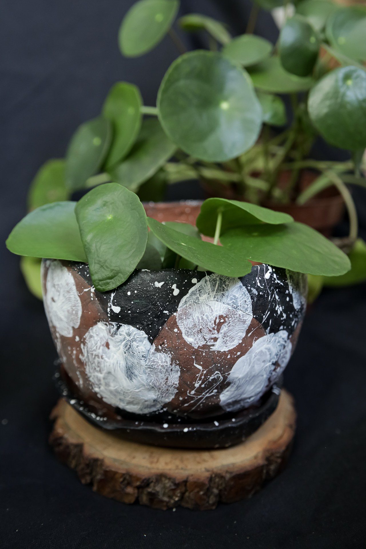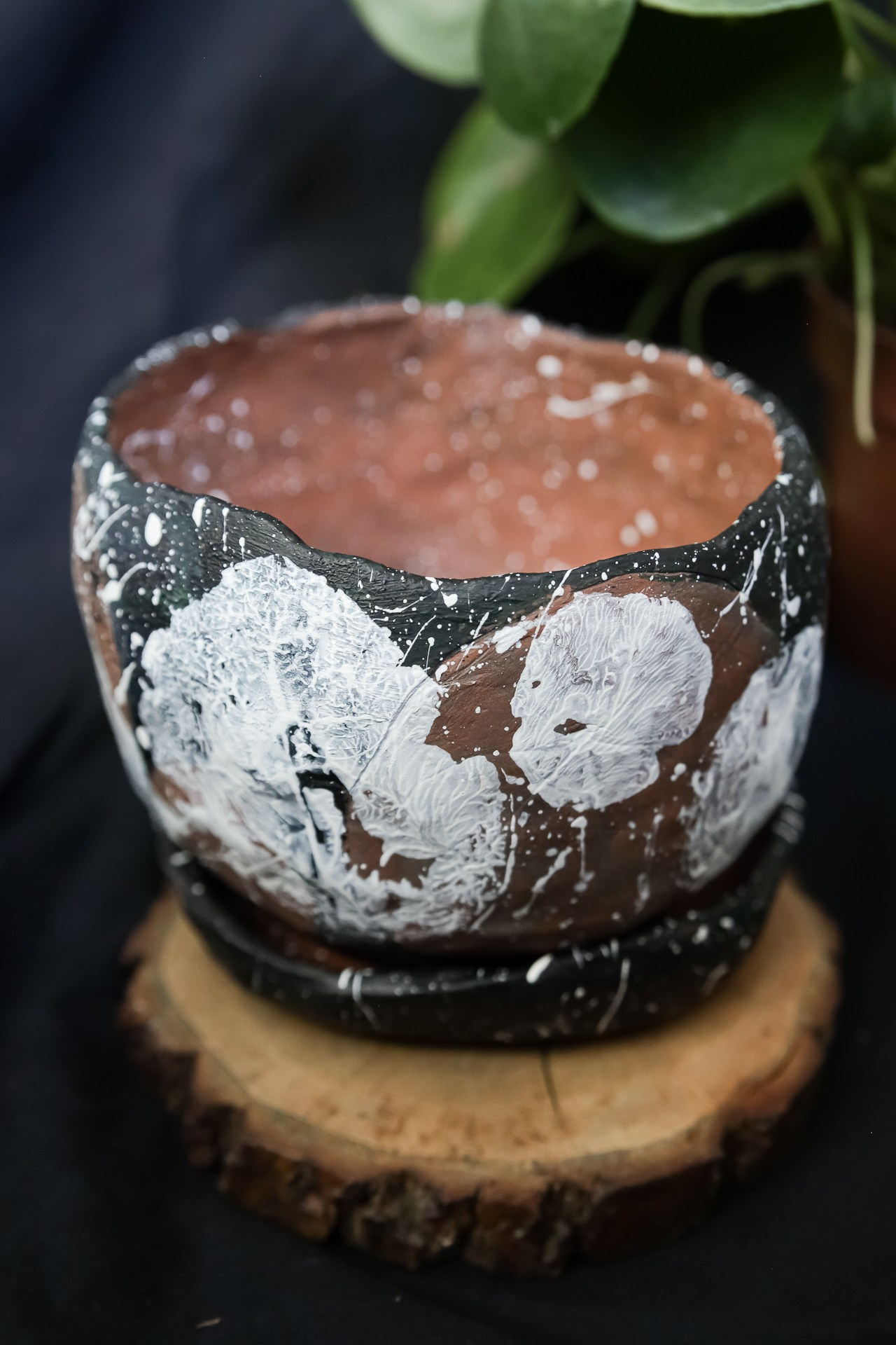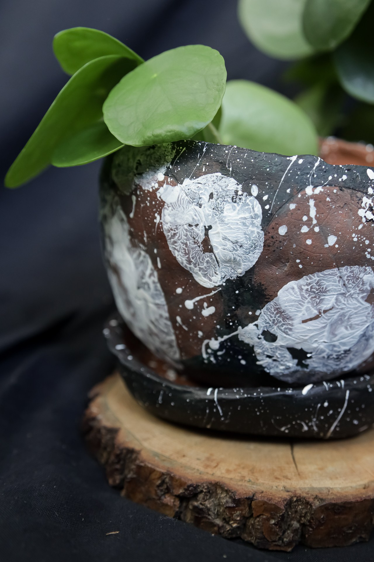 С отпечатками листьев пилеи пиперомиевидной.С поддоном.Покрыт акрилом и лаком.Высота 9 смДиаметр 12 см1000 р.